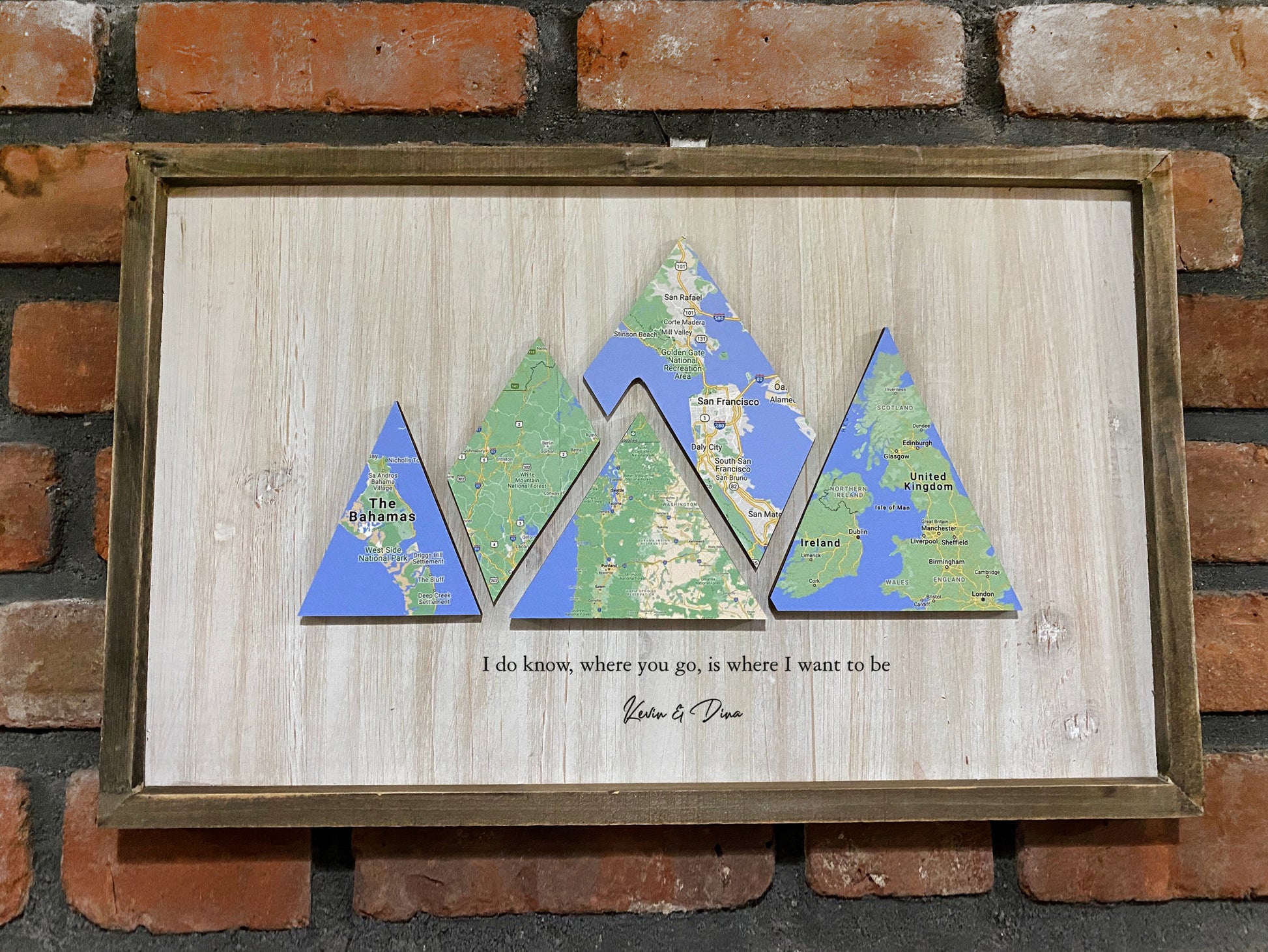 DMSC Designs is proud to present. The Journey Of Us Personalized 3D Map Art. This is a truly one of a kind design as each one is unique to you! We will print a high quality water color maps of notable adventures you have taken together. It is printed on high textured museum quality parchment. We will hand cut the image in the shape of the mountains. Each peice is then mounted on pieces of laser cut basswood of varying thicknesses from 1/8 to 1/4 in thick. Giving a staggered 3d effect to the mountain design. Then engraved to with your personalization Then mounted on a wall mount that is hand antiqued to give a reacclimated wood style.